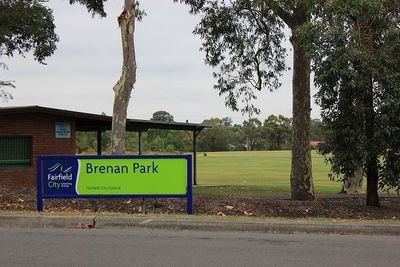 Brenan Park is a nature reserve and sports complex with open grasslands, bushland, and recreational areas featuring native eucalyptus trees scattered across the land. The site includes nine soccer fields, three cricket pitches, baseball diamonds, and six floodlit tennis courts for various activities.