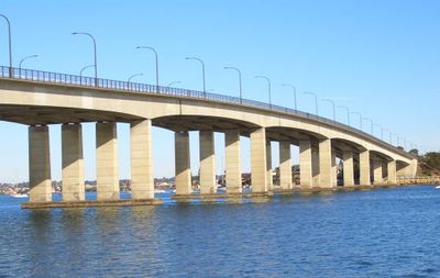 The bridge foundations extend 67 meters below water level to reach the sandstone base, making it a substantial engineering achievement in Australian infrastructure.