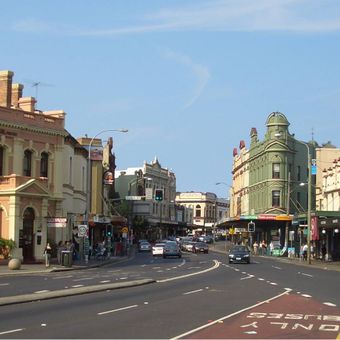 Newtown is an inner-city suburb of Sydney that spans several blocks with residential areas, shops, cafes, and restaurants throughout. The neighborhood is densely developed and connected by streets with a strong local character running through it.