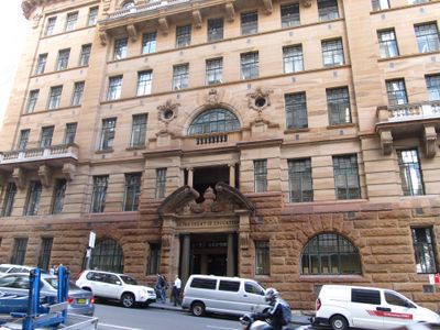 The Department of Education Building occupies an entire city block bordered by Bridge, Loftus, Bent, and Young Streets with four sandstone façades.