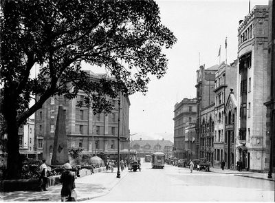The triangular Macquarie Place features monuments, mature trees, and green spaces within the commercial center of Sydney near Bridge Street.