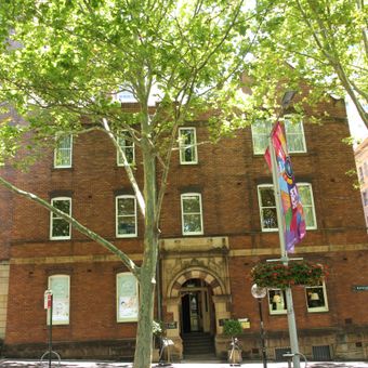 The three-story red brick building with stone decorations stands on Macquarie Street, featuring architectural elements from late Victorian period and Federation Free Style design.