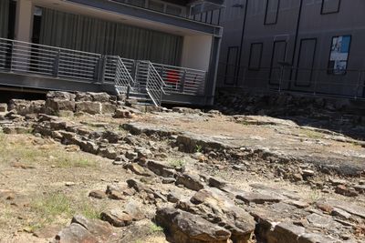The Cumberland Street Archaeological Site spans across 106-128 Cumberland Street, containing preserved remains beneath an elevated modern youth hostel building.