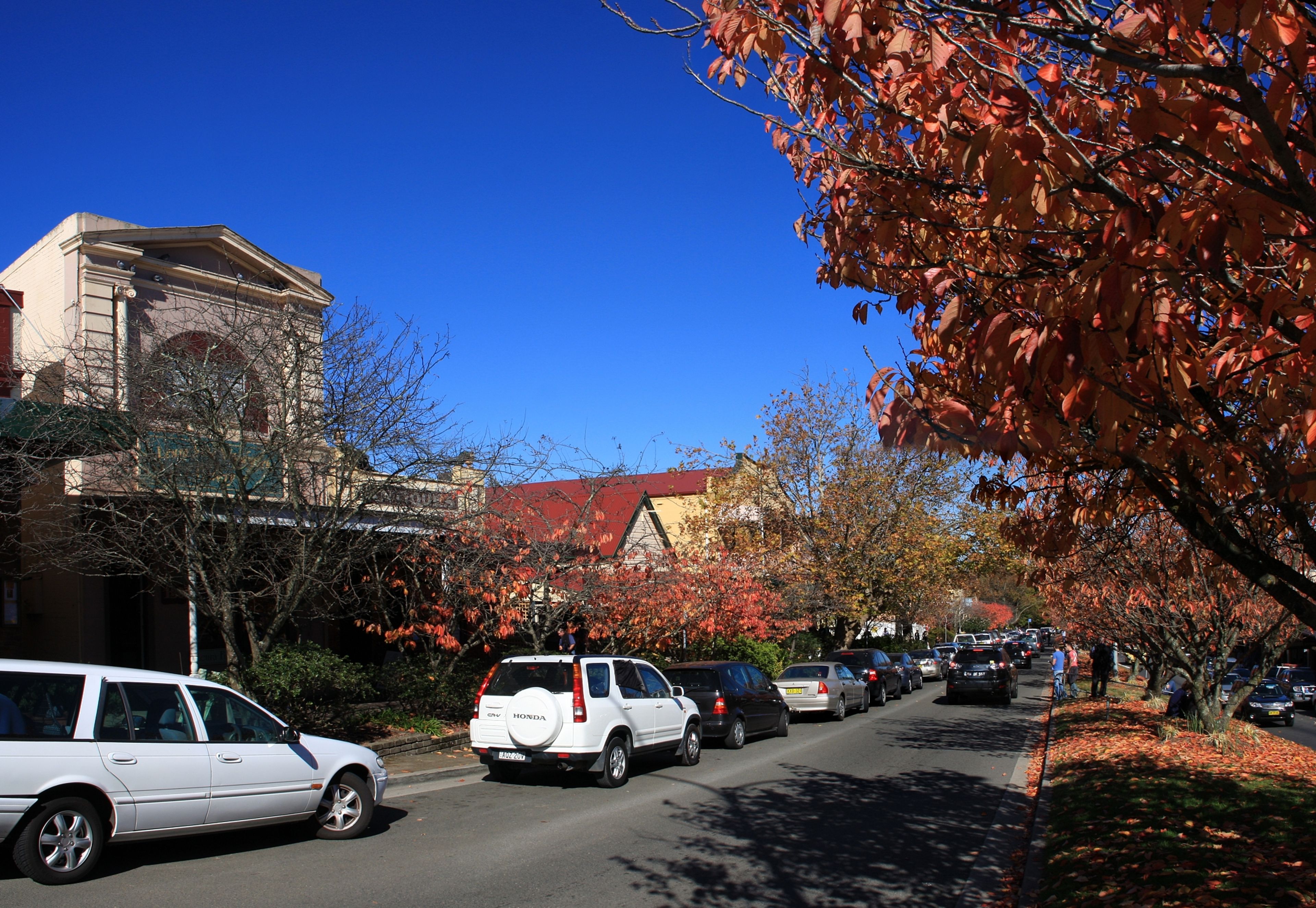 Located 100 kilometers west of Sydney, Leura features a main street filled with boutiques, restaurants, galleries, and cherry trees at 985 meters elevation.