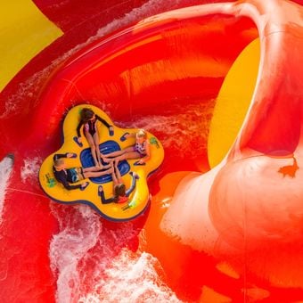 The water park features specialized attractions like the Bombora slide, where riders experience weightlessness before descending onto a wave-shaped surface.