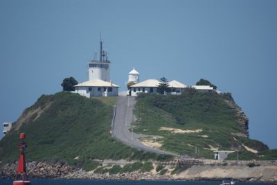 The white cylindrical tower with a lantern and balcony stands 9.8 meters tall at the entrance of Newcastle Harbour in New South Wales.