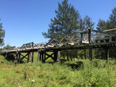 The Monkerai Bridge stands as the second oldest timber truss bridge in New South Wales, exhibiting the Old PWD design with three truss spans and three approach spans.