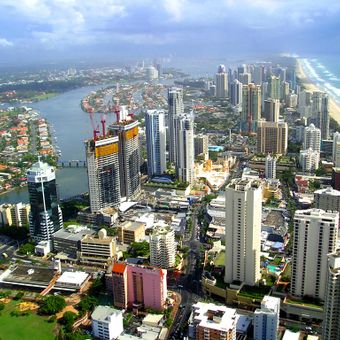 Gold Coast is a coastal city in southeastern Queensland that spreads along roughly 70 kilometers of Pacific shoreline. High-rise buildings stand along the beach, with residential neighborhoods, shopping centers, and theme parks set behind them amid flat to gently rolling terrain.