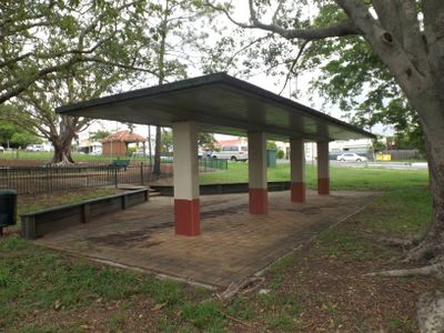Located adjacent to a playground beneath fig trees, the shelter maintains its structural integrity and serves as a public park facility.