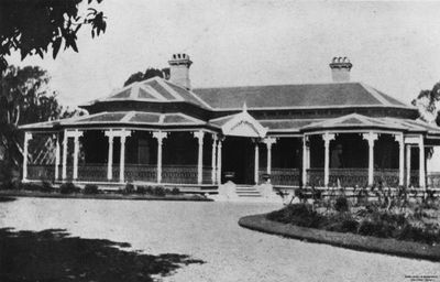 The low-set villa features rendered brick walls, imported reddish slate roofs, and verandahs adorned with cast iron balustrades along three sides.