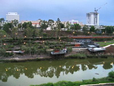The urban center spans 1090 square kilometers along the Bremer River, featuring over 550 parks and 6000 heritage-listed buildings across its territory.