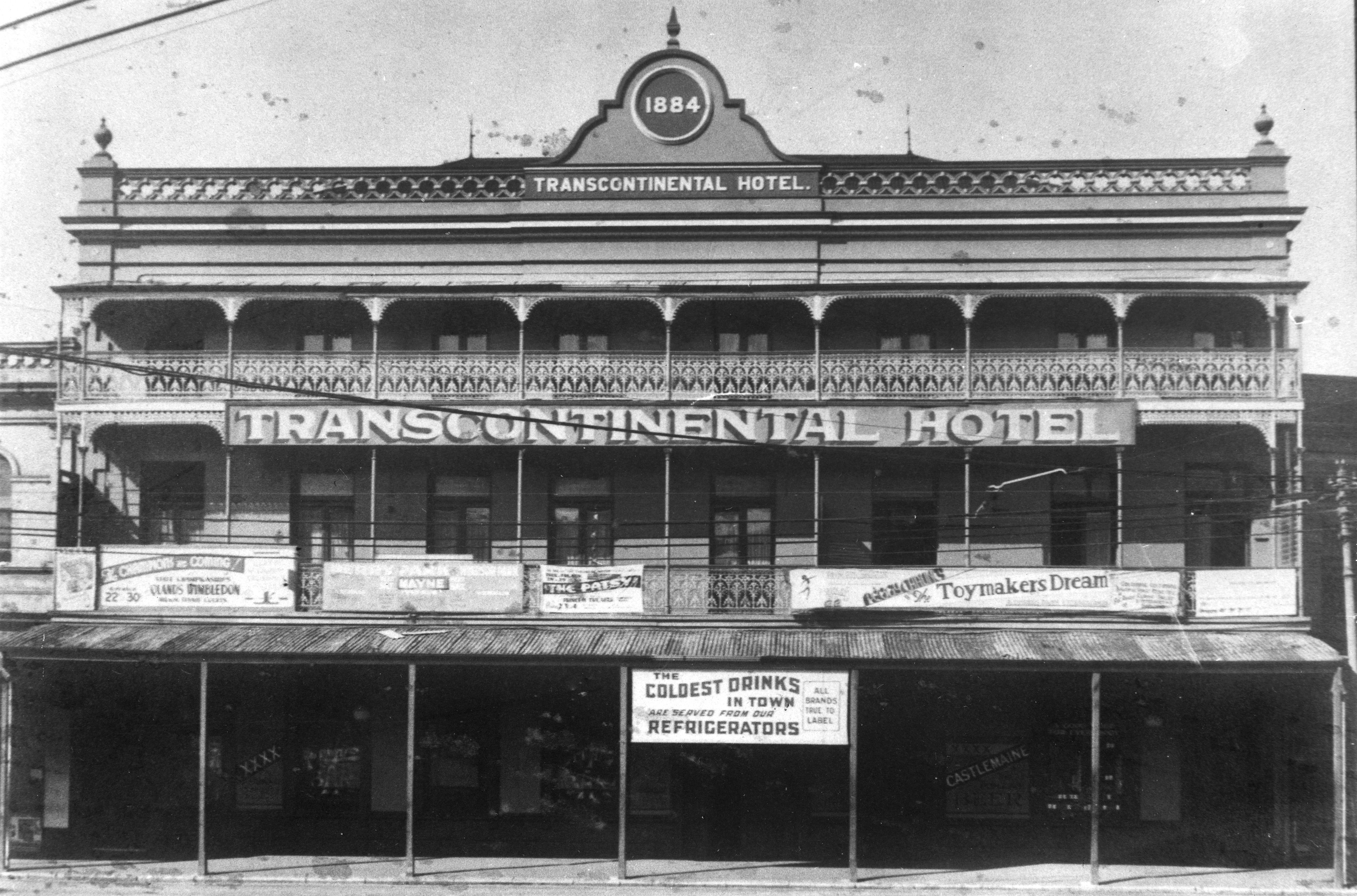 The Transcontinental Hotel stands as a four-storey Victorian building featuring intricate cast iron lacework, ornate balconies, and decorative brickwork that exemplifies late 19th-century architectural craftsmanship in Brisbane's central business district.