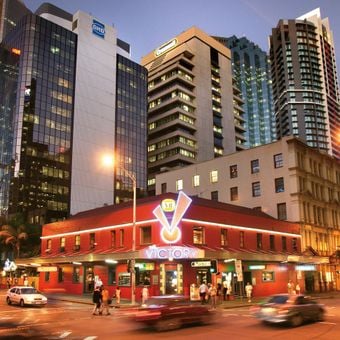 The Victory Hotel occupies a corner position at Edward and Charlotte Streets, featuring two levels with six bars, a lounge, deck, and beer garden.
