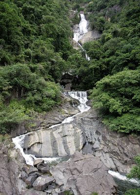 Surprise Creek Falls drops 243 meters through multiple cascades, creating pools and rock formations within the Wet Tropics World Heritage area.