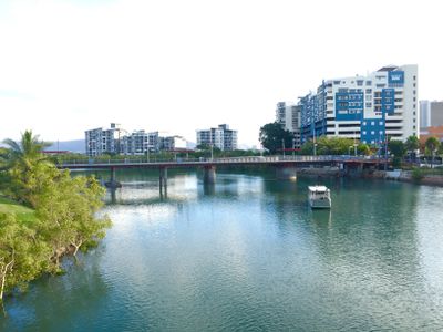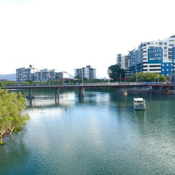 The pedestrian bridge provides direct access between the central business district and South Townsville, with multiple shops integrated into its structure.