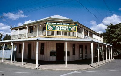 The Victoria Park Hotel stands as a two-story timber structure featuring a notable corner entrance and architectural elements characteristic of Queensland hotels from the 1890s.