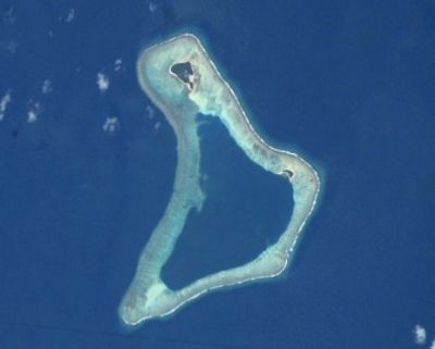 Two small islands connected by a coral reef structure form a circular atoll with a 6-kilometer diameter lagoon in the southwestern Pacific Ocean.