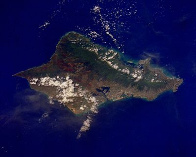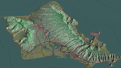 Measuring 44 miles long and 30 miles wide, Oahu features two shield volcanoes, the Waianae and Koolau mountain ranges, with Kaala reaching 4,003 feet.
