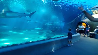 A 240-degree acrylic tunnel allows visitors to walk through a massive tank where sharks, stingrays, and tropical fish swim overhead and alongside.