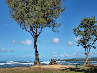 Kaiaka Bay Beach Park extends across 53 acres of land, featuring grassy areas, mature trees, and a mix of sandy and rocky shorelines along the coast.