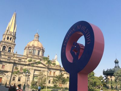 The monument records statistics about femicides in Jalisco, where 230 women were killed between January and September 2020, with 39 cases investigated as femicides.