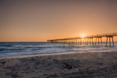 The sandy shoreline extends along the Pacific Ocean with a concrete pier stretching into the water and offering panoramic views of the coast.