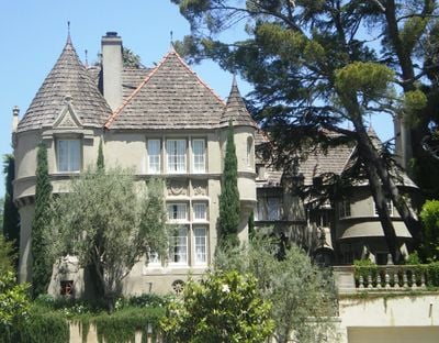 Chateau Colline is a brick residential building with eight apartments on Wilshire Boulevard that combines French design with turrets, climbing vines, and leaded-glass windows. The structure preserves original features like wood-burning fireplaces and barrel-vaulted ceilings in each private apartment.