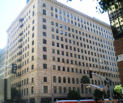 The structure maintains its original architectural features while functioning as a modern office space in the heart of Los Angeles financial district.