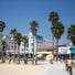 Venice is a beach district in Los Angeles that stretches along the Pacific coastline and features a wide pedestrian boardwalk lined with palm trees and low-rise buildings. Behind the beachfront lie narrow alleys with shops, cafés, and residences, while the canals a few blocks inland form small waterways crossed by pedestrian bridges.