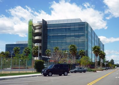 Multiple entrances from Grand Central Avenue and Flower Street provide access to the campus, which includes structured parking facilities for employees.