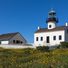 The Old Point Loma lighthouse is a two-story Cape Cod style building with a centered tower that rises 14 meters above the ground. The structure combines the keeper's living quarters with the signal tower, showing the practical architecture typical of mid-19th century coastal stations.