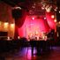 Hotel Café is a music venue on Cahuenga Boulevard in Hollywood featuring a stage with dining tables positioned directly in front of it. The bar runs along a hallway area with raised seating, allowing guests different vantage points from the entrance through to the service area.