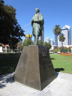 The monument stands in Pantoja Park, named after Juan Pantoja y Arriaga, who created the first detailed map of San Diego Bay in 1782.