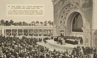 Brothers John and Adolf Spreckels donated the organ pavilion to San Diego for the 1915 Panama-California Exposition, with construction completed in 1914.