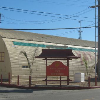 The WWII/Korea LVT Museum displays amphibious tracked vehicles in a Quonset hut-style building near the Assault Amphibian School Battalion Training Command.