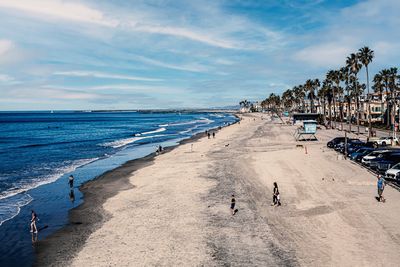 Harbor Beach extends along the Pacific coastline with a wide sandy shore near the Oceanside marina and harbor, providing space for numerous water activities.