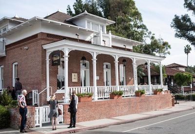 The Richard Egan House features classical elements with brick walls and a white wooden patio porch at 31829 Camino Capistrano in downtown San Juan Capistrano.