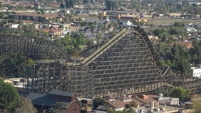The roller coaster follows an L-shaped double out and back pattern, featuring a 51-degree drop angle and maintains its position as the longest wooden coaster on the West Coast.