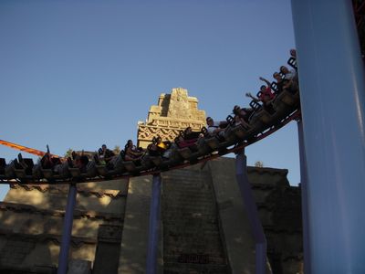 The design incorporates elements from Mesoamerican traditions, with architectural details and decorative patterns reflecting ancient civilizations throughout the ride experience.