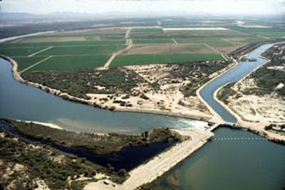 The Blythe Intake diverts water from the Colorado River through an irrigation canal system to supply the agricultural lands of Palo Verde Valley.