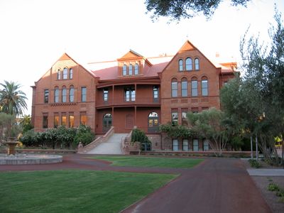 The Victorian-style Old Main features red brick exteriors, decorative trim, and a bell tower rising above the Arizona State University campus in Tempe.
