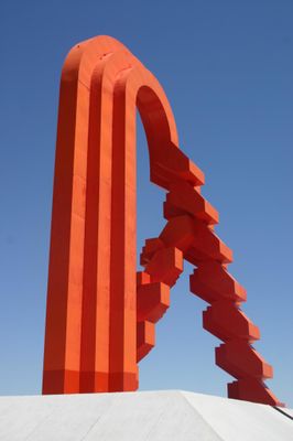 The Puerta de Chihuahua rises 43 meters high and consists of 500 tons of orange-colored steel forming geometric shapes and architectural elements.