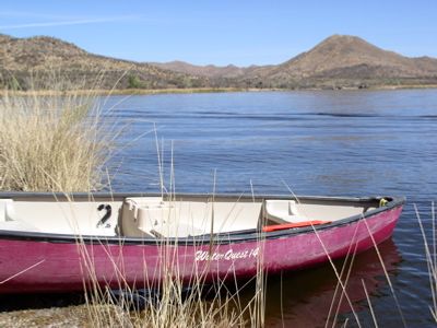 Patagonia Lake State Park spans 2,658 acres of land featuring a lake surrounded by hills and native vegetation in southeastern Arizona.