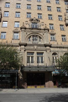 The Hotel Cortez stands eleven stories tall at 300 North Mesa Street, featuring classical architectural elements and Spanish Colonial Revival influences throughout its structure.