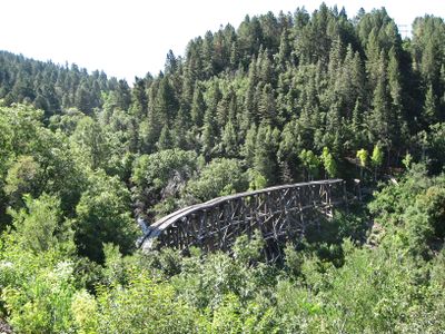 The Mexican Canyon Trestle extends 323 feet in length and rises 52 feet above the canyon floor, featuring curved sections supported by vertical timbers.