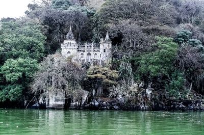 Castillo de Dorión is a stone castle near Lake Amatitlán featuring European military architecture with local influences, towers, thick walls, and surrounding gardens. The building displays a mix of fortress design and decorative elements characteristic of its construction period.