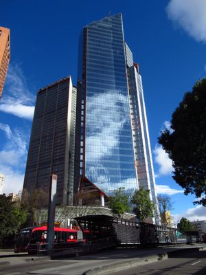 The complex features 73 elevators across both towers, providing efficient vertical transportation for occupants and visitors throughout the buildings.