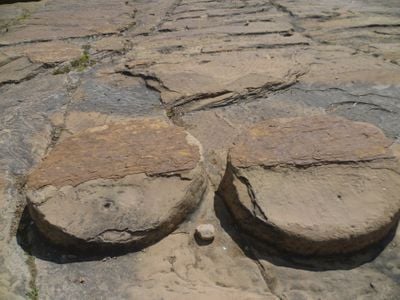 The Cojines del Zaque consists of two circular sandstone formations measuring 1.1 meters and 1 meter in diameter, situated near the center of Tunja.