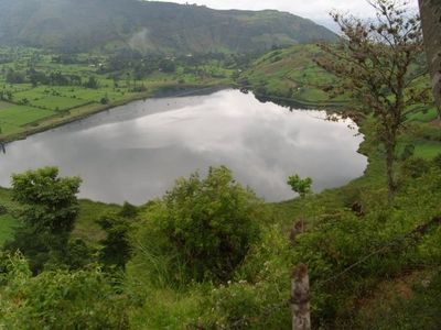The freshwater lagoon sits within the Garcia Rovira province, surrounded by green slopes and offering views of the Chicamocha Canyon.