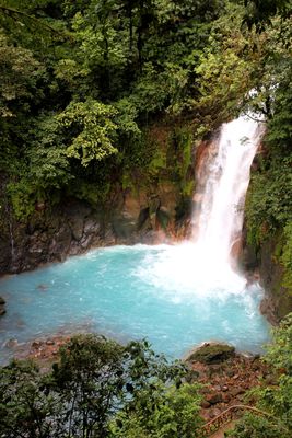 The Rio Celeste waterfall drops 98 feet into a bright blue pool within dense tropical forest of Tenorio Volcano National Park.